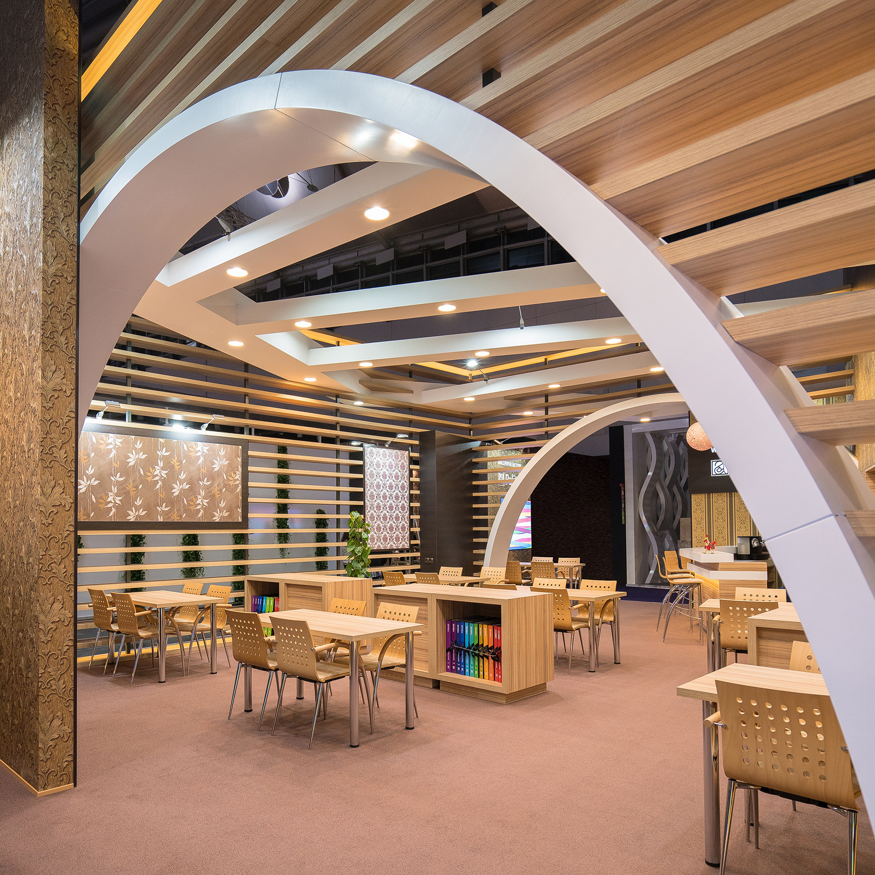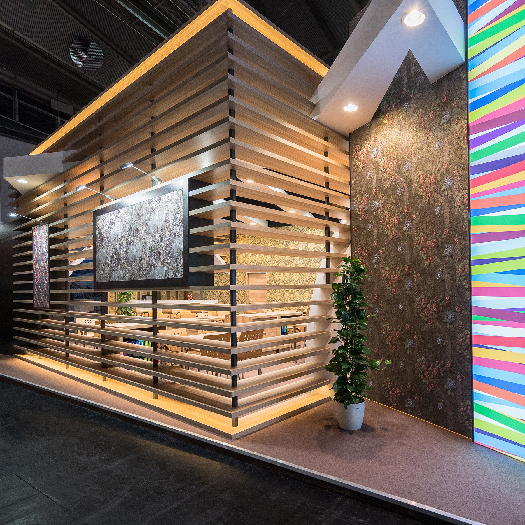 Der Messestand „Lines in the Space“ für KOF Palitra auf der Heimtextil 2017 in Frankfurt (126 m²) beeindruckt durch ein ästhetisches Konzept, das auf der Idee farbiger, sich kreuzender Bänder basiert. Diese Idee wird durch verschiedene architektonische Linienformen umgesetzt: gerade Wände, halbrunde Bögen und geschwungene Friese.